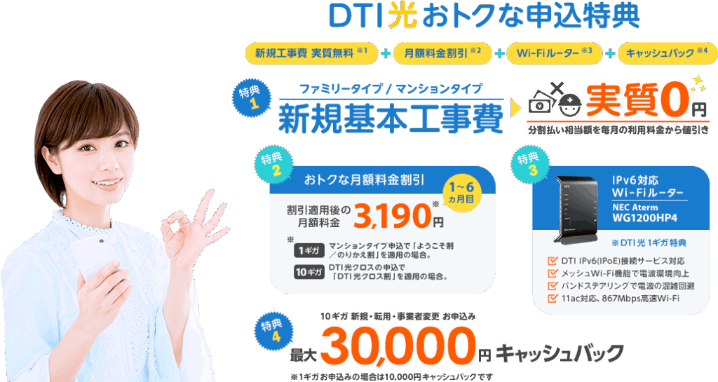 - 今なら高性能Wi-Fiルーターもプレゼント(DTI光1ギガのみ)