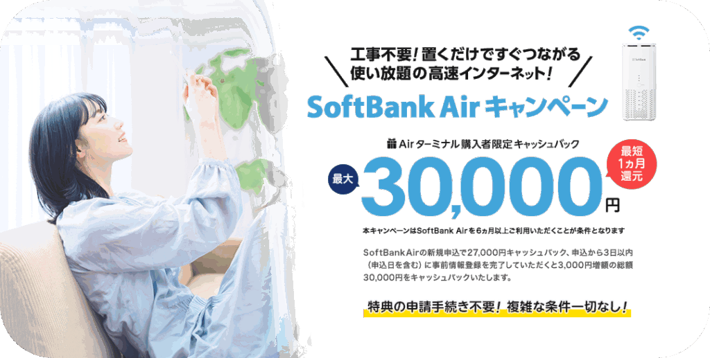 キャンペーン内容 | 新規申込…30,000円キャッシュバック Airターミナルの購入者限定 |